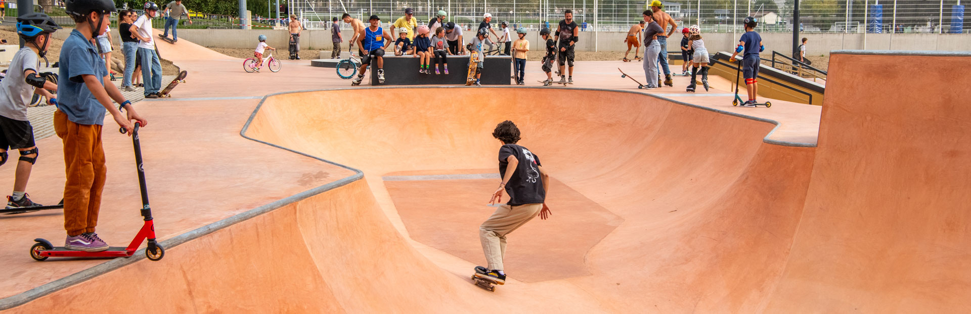 D’une surface de 2 000 m2, le skatepark comprend 30 spots (plans inclinés, pole jam, long curb, china banks, slappy, double slappy, barres de glisse, ledge, handrail, gap, eurogap, bowl...) permettant aux débutants, comme aux plus aguerris, de pratiquer du roller, du BMX, de la trottinette ou du skate, en pratique libre comme en compétition (l’âge minimum d’accès à cet équipement est de 8 ans).
