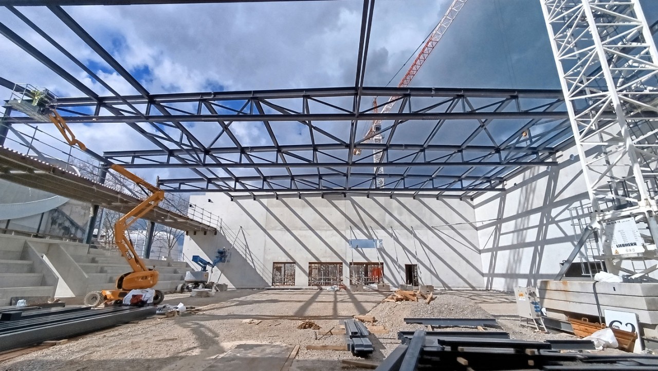 Sur la première partie du chantier, le gros oeuvre en béton armé est désormais quasiment achevé. Les dernières finitions sont en cours et le démontage de l’une des grues installées sur le site est prévu fin avril. Dans les prochains jours, les travaux se poursuivront avec la couverture du bâtiment et la réalisation des façades. Une fois cette étape achevée, le chantier basculera sur la seconde structure qui est la salle de match. La fabrication des éléments de charpente de cette seconde salle est actuellement en cours et leur montage doit débuter dans les prochaines semaines.