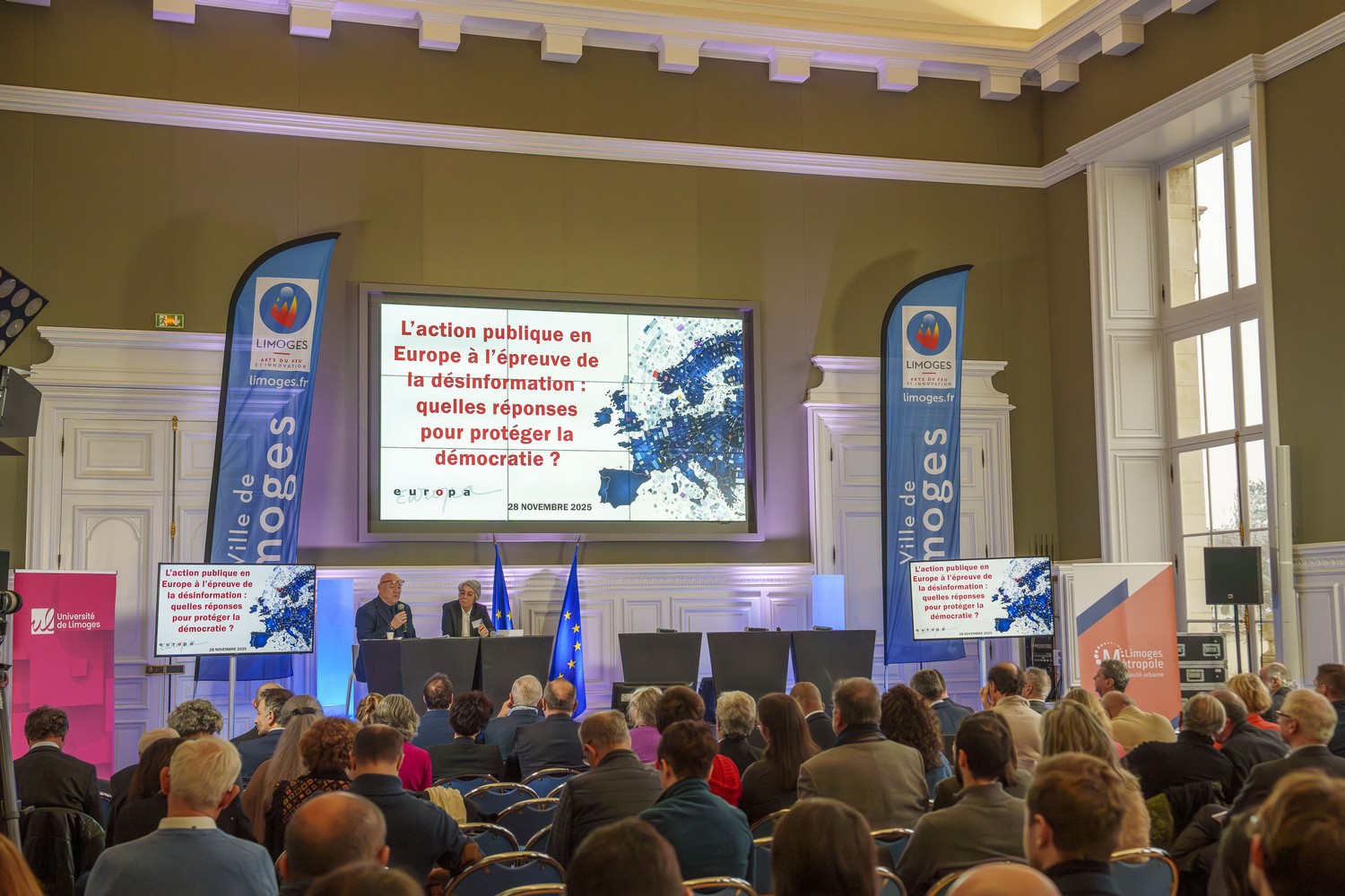 Comme l’a expliqué en introduction Michel Senimon, délégué général d’Europa, « la désinformation est une menace qui décrédibilise l’action publique dans le sens où elle influe sur la confiance des citoyens ». C’est ainsi que durant toute la journée, les orateurs se sont succédé à la tribune pour exposer leurs points de vue et débattre avec le public.