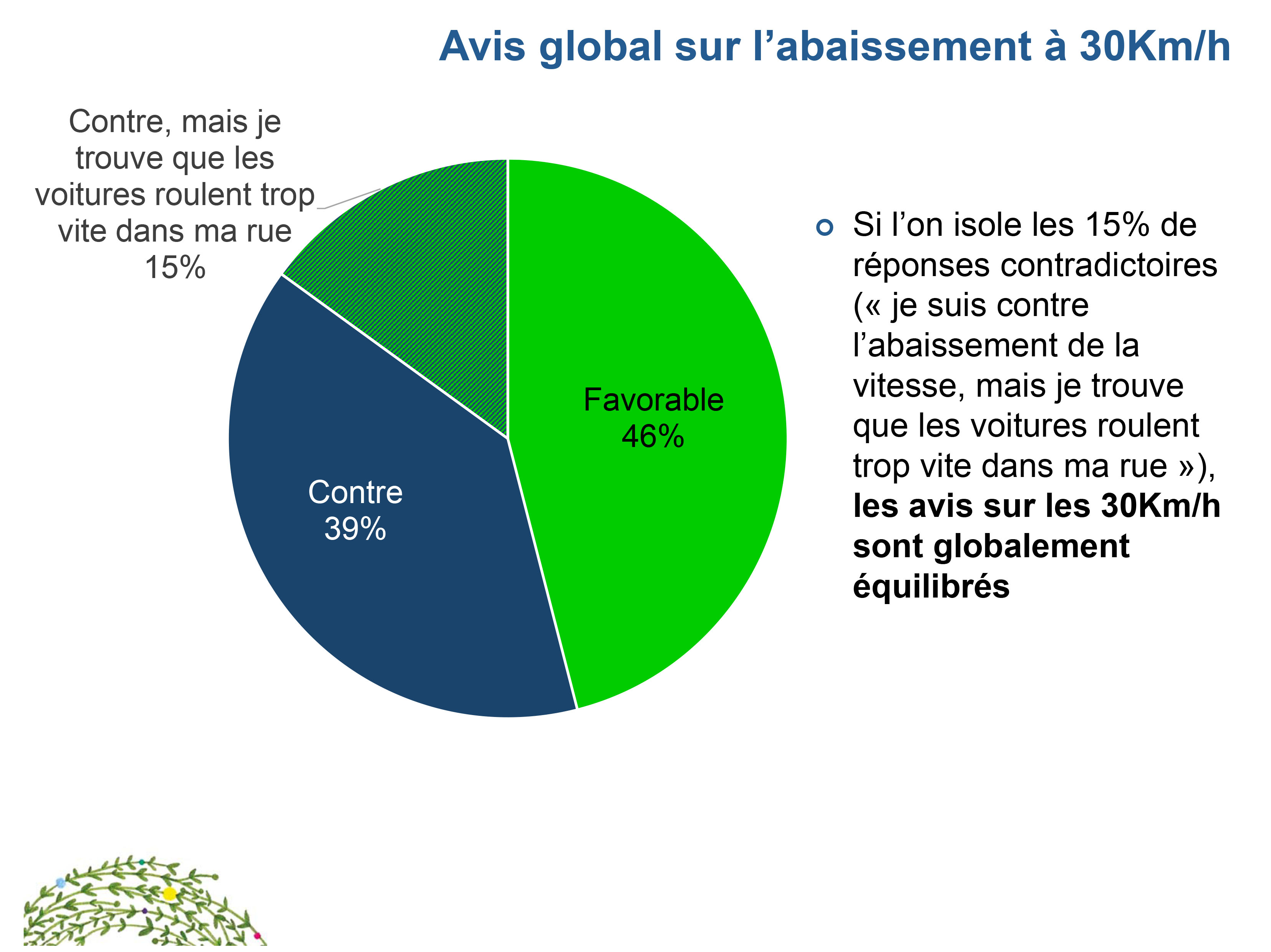 - 46 % des personnes sont favorables à l’extension des 30 km/h dans Limoges. 39 % des personnes sont opposées et 15 % sont opposées mais estiment que les voitures roulent trop vite dans leur rue.