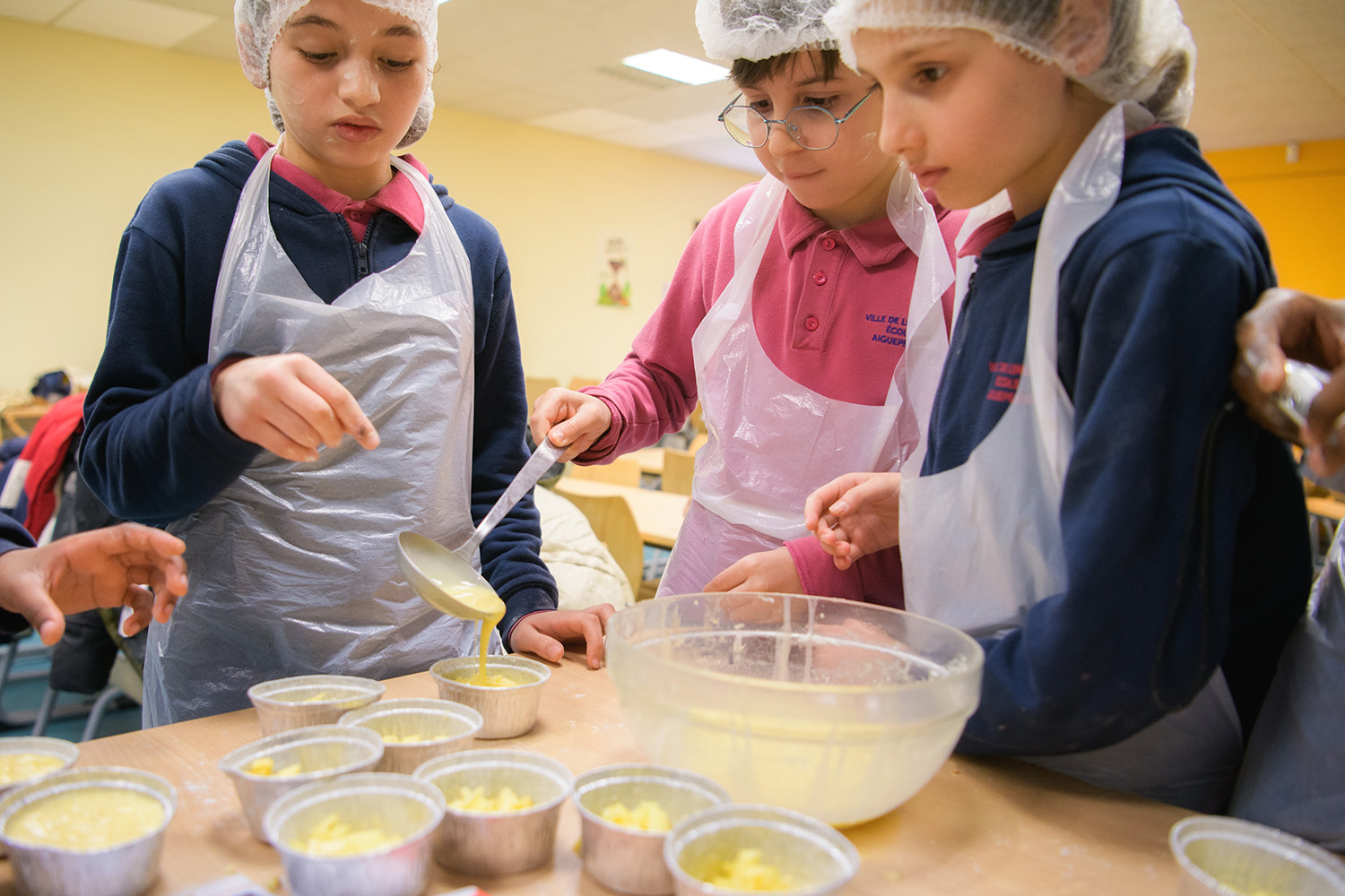 Durant une heure, les élèves ont épluché les pommes, cassé les œufs, mélangé le lait et la farine, versé dans les moules sans en mettre à côté ou presque. Clotilde Jalladeau, diététicienne de la Ville était à leur côté pour leur prêter main forte et répondre à leurs questions. « Attention aux proportions, on enlève ce qui est en trop ! Et pour rendre la flognarde plus onctueuse, on peut remplacer une partie du lait par des Petits-suisses ou du fromage blanc ».