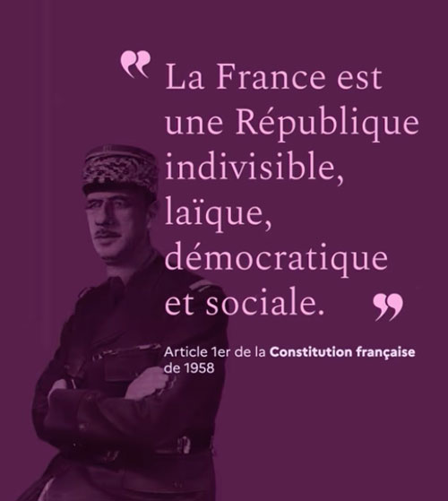 Le premier alinéa de l'article 1er de la Constitution de 1958 prévoit que « la France est une République indivisible, laïque, démocratique et sociale. Elle assure l'égalité devant la loi de tous les citoyens, sans distinction d'origine, de race ou de religion. Elle respecte toutes les croyances.