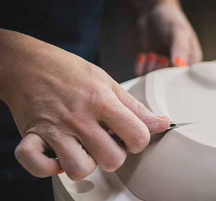 Une fois sèche, quelques finitions sont apportées à chacune des assiettes qui peuvent être cuites une première fois.