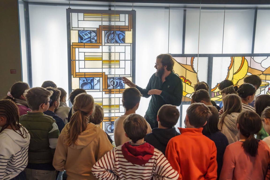 Dès l’entrée décorée de vitraux colorés, Sandrine Coulaud, directrice adjointe du lieu, accueille la classe. Elle explique qu’« un vitrail n’existe que si la lumière le traverse ». C’est ce qui fait la différence entre un vitrail et une peinture.