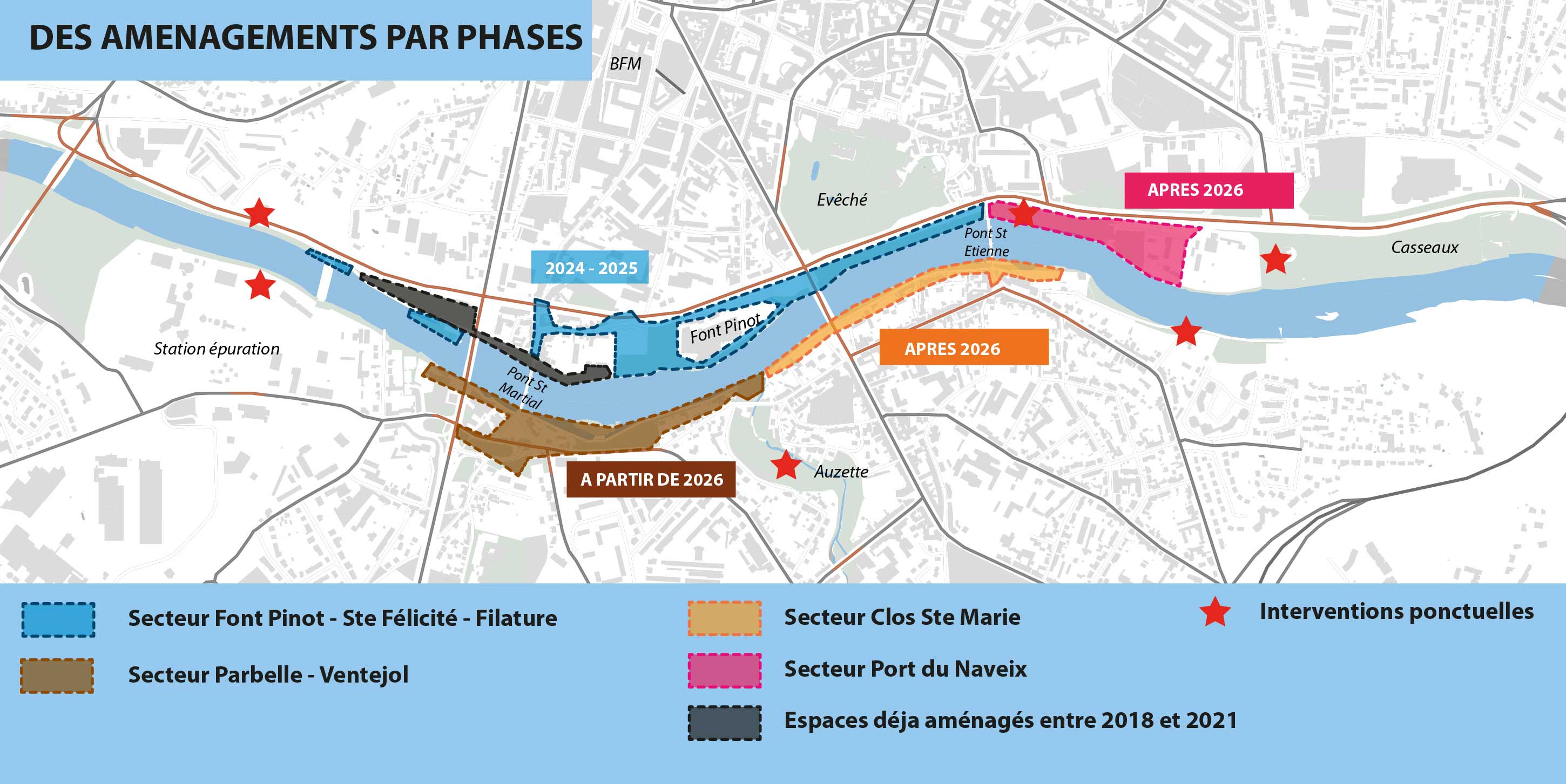 Les aménagements les plus notables se concentreront en cœur de parc (entre les ponts st Martial et st Etienne) autour de 4 secteurs stratégiques et d’un nouveau franchissement de la Vienne. La durée de l’ensemble des travaux est estimée à environ 8 ans à compter de fin 2023 et nécessiteront des interventions conjointes de la Ville de Limoges et de Limoges Métropole.