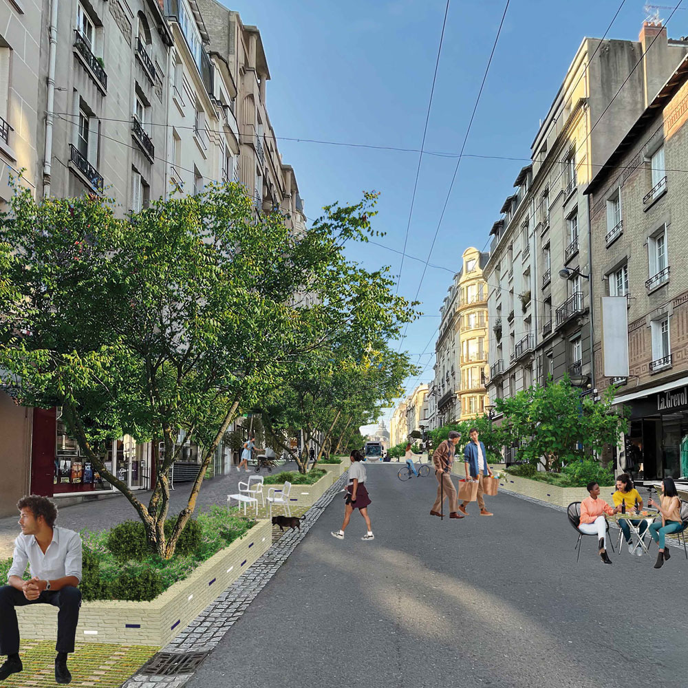 Tout autour de ces plantations, des pavés enherbés viendront valoriser le caractère durable de la rue en favorisant la désimperméabilisation des sols et en limitant le réchauffement renvoyé par l’asphalte lors des fortes chaleurs.