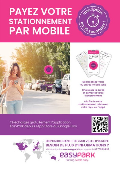 Pour plus de confort, il est possible de payer votre stationnement avec votre smartphone. À compter du 1er juillet, l’application ParkNow devient EasyPark. Elle est téléchargeable gratuitement depuis l’Apple Store ou Google Play Store.