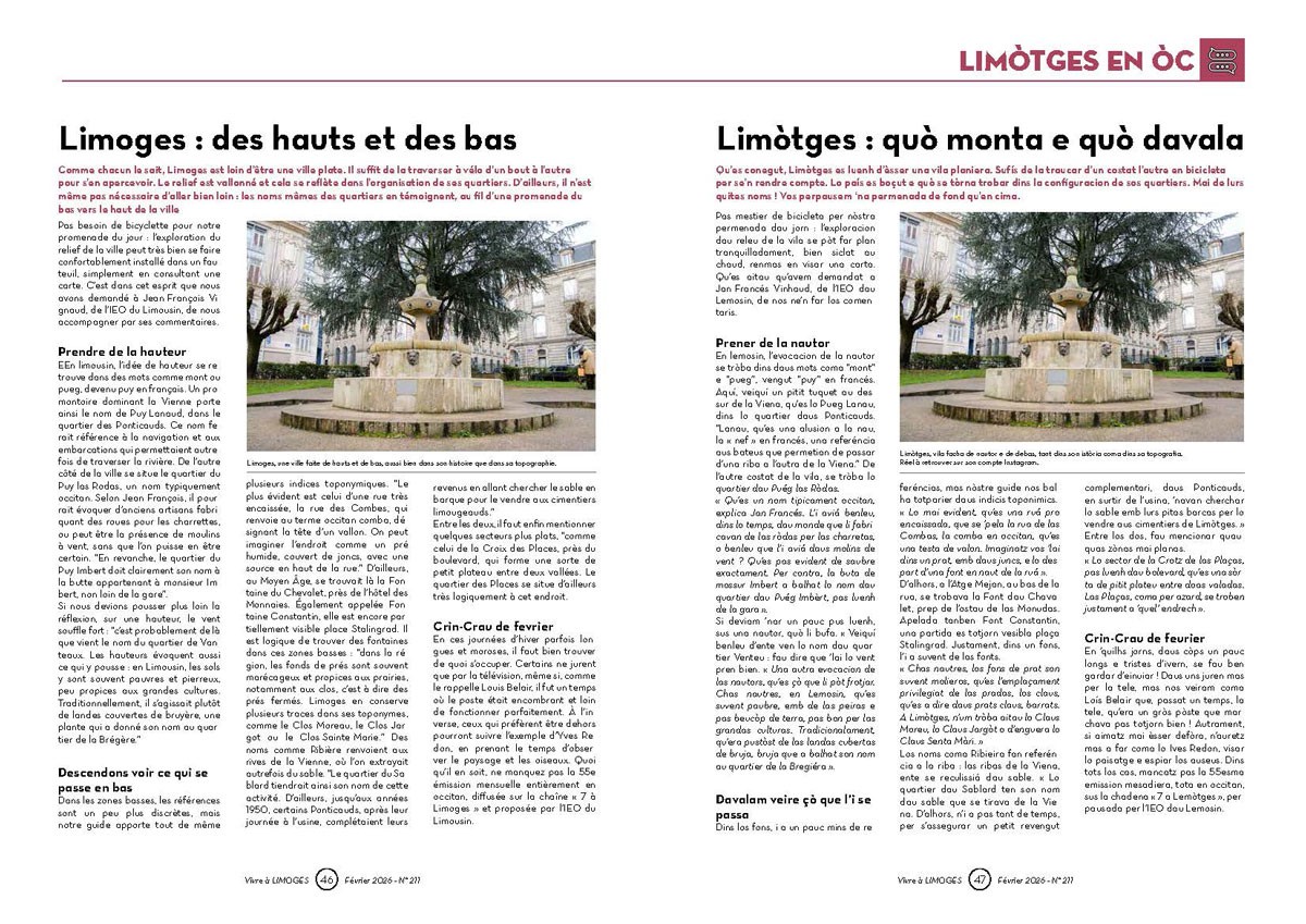 En occitan En occitan n° 211 - Février 2026 1 document Publié le 28 janvier 2026 Tous les mois, retrouvez la page en occitan du magazine municipal vivre à Limoges et sa traduction. En occitan n° 211 - Fév. 2026 PDF-93.29 Ko Télécharger Feuilleter Précédent Retour à la liste Suivant