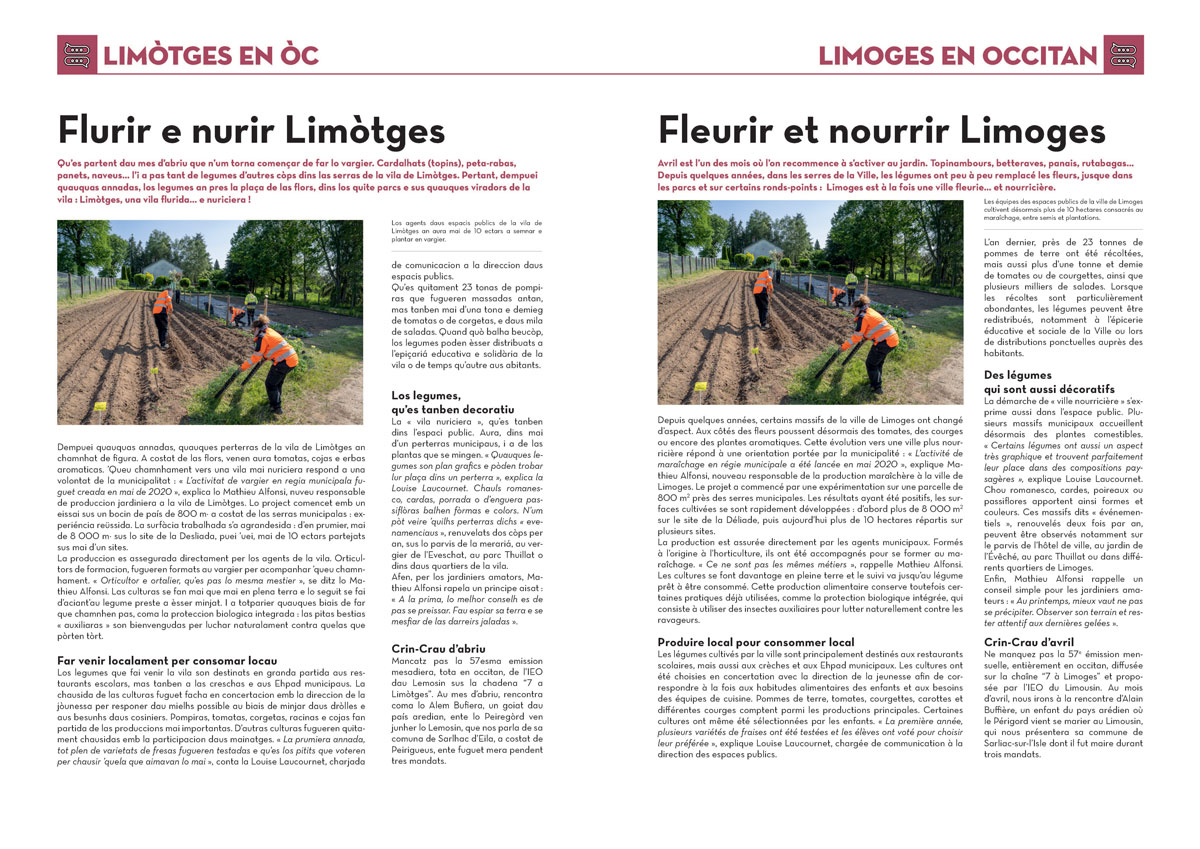 En occitan En occitan n° 213 - Avril 2026 1 document Publié le 30 mars 2026 Tous les mois, retrouvez la page en occitan du magazine municipal vivre à Limoges et sa traduction. En occitan n° 213 - Avril 2026 PDF-1.2 Mo Télécharger Feuilleter Précédent Retour à la liste Suivant